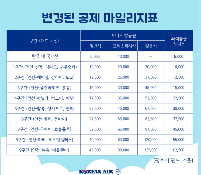 일반석 공제 마일리지는 기존 대비 인하 또는 유지된 노선도 있습니다만, 국제선 기준이 세분화 되면서 장거리 비행일수록 마일리지 차감 폭이 늘어나게 됐습니다.