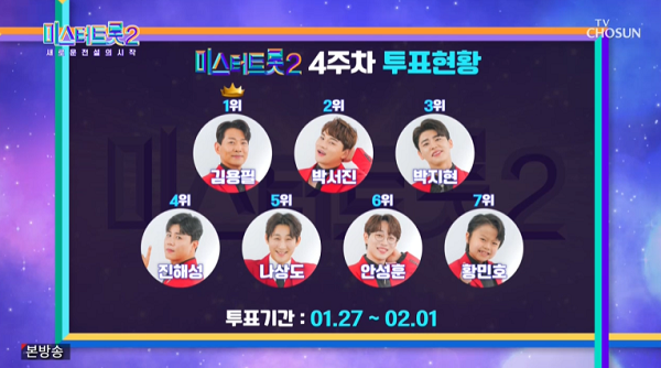 미스터트롯 2 4주 차 인기투표결과는 1위 김용필, 2위 박서진, 3위 박지현, 4위 진해성, 5위 나상도, 6위 안성훈, 7위 황민호로 지난 3주 차의 TOP7출연자들의 순위변동만 있을 뿐 4주 차에서도 TOP7의 자리를 지키고 있습니다.