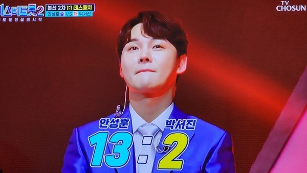 이번 대결의 승자는 안성훈 13 하트 : 박서진 2 하트로 안성훈이 다음라운드에 진출했습니다.