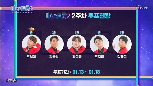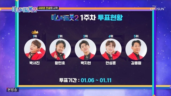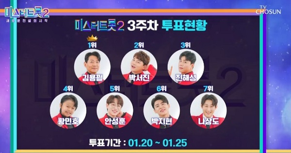 지난 1주 차부터 이번 3주 차까지 결과는 매번 방송 때 발표가 났었는데요. 황민호는 예선 선을 이어 1주 차에 2위를 했었고 2주 차에는 순위밖 성적이었다가 다시 3주 차 투표결과는 4위에 오르게 되었습니다.