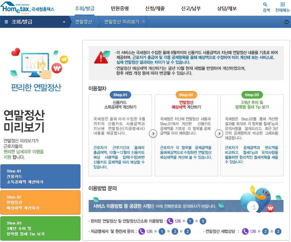 미리 연말 정산이 얼마나 되는지 알아보는 연말정산 미리 보기 서비스도 제공이 되는데요. 맞벌이 부부나 부양가족이 있다면, 부부 중에 누구의 공제를 받아야 더 절세가 가능한지 미리 계산해보는 서비스입니다. 전년도 연말정산금액 기준으로 대략적인 계산이기 때문에 실제 연말정산 결과와는 다를 수도 있습니다. 공제금액은 확인 가능하니 미리 전략을 세우는 것도 좋겠습니다!