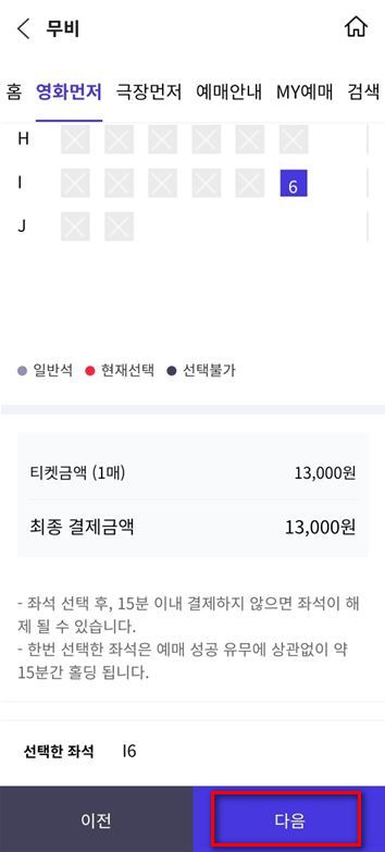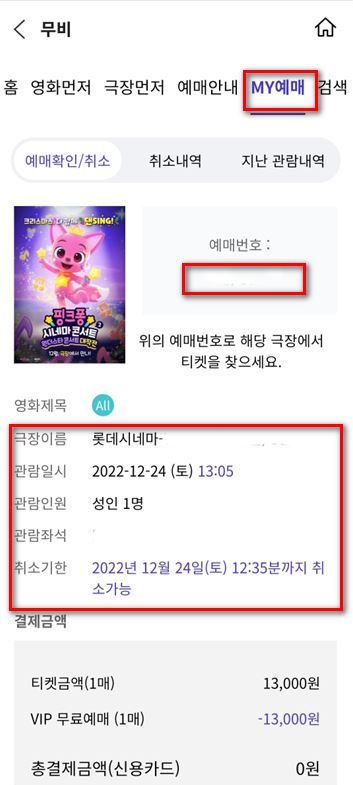 상단에 MY예매에 들어가면 예매하신 정보가 나옵니다. 날짜, 시간 잘 확인해 주세요~