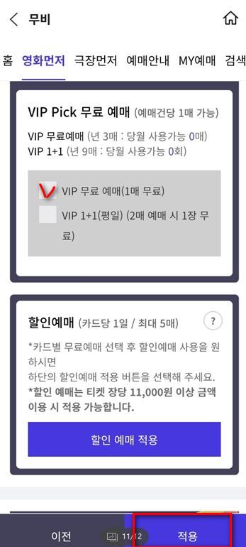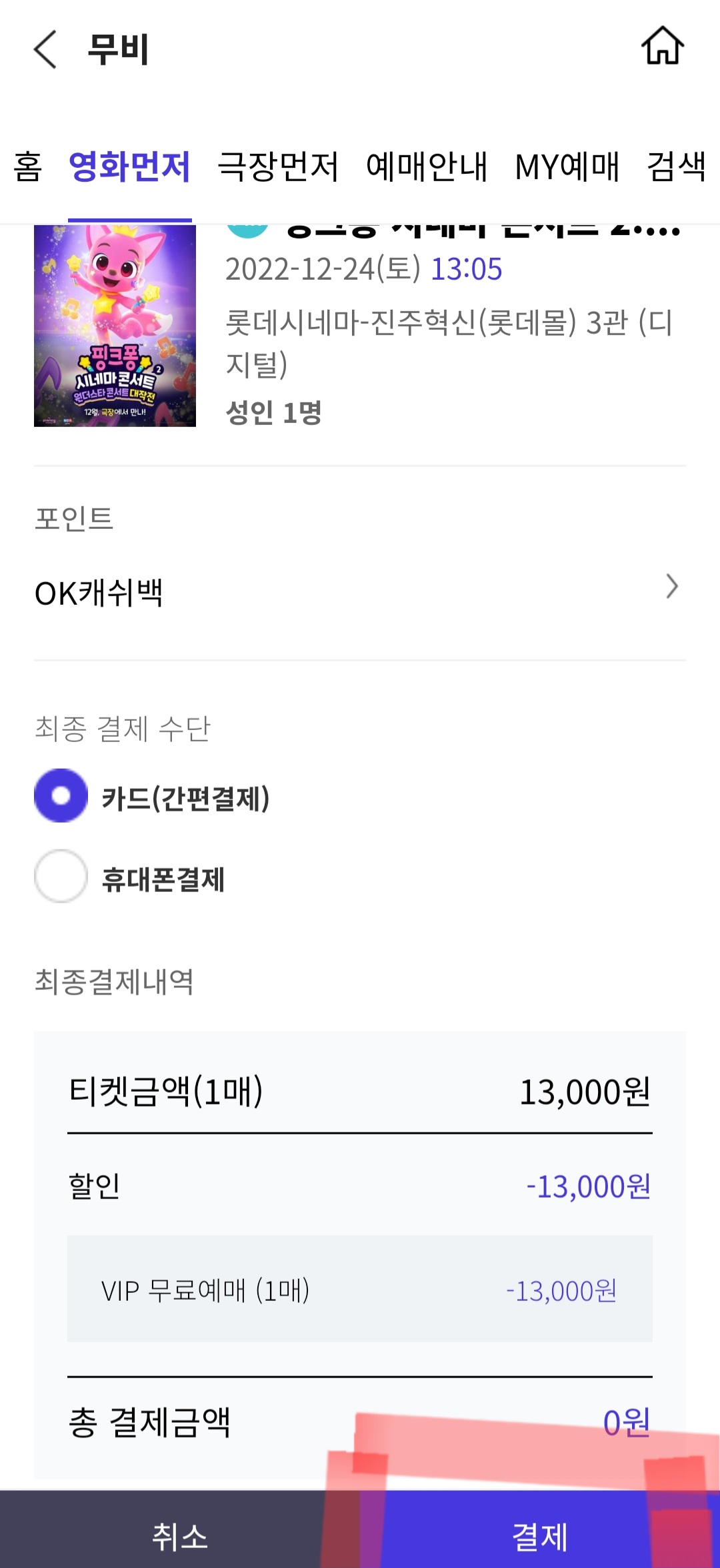 VIP 무료예매인지, 할인예매인지 선택해 주고 적용하면 결제창이 나오는데요. 무료 예매이기 때문에 총 결제금액은 0원! 그리고 결제 누르면 영화 예매 끝!